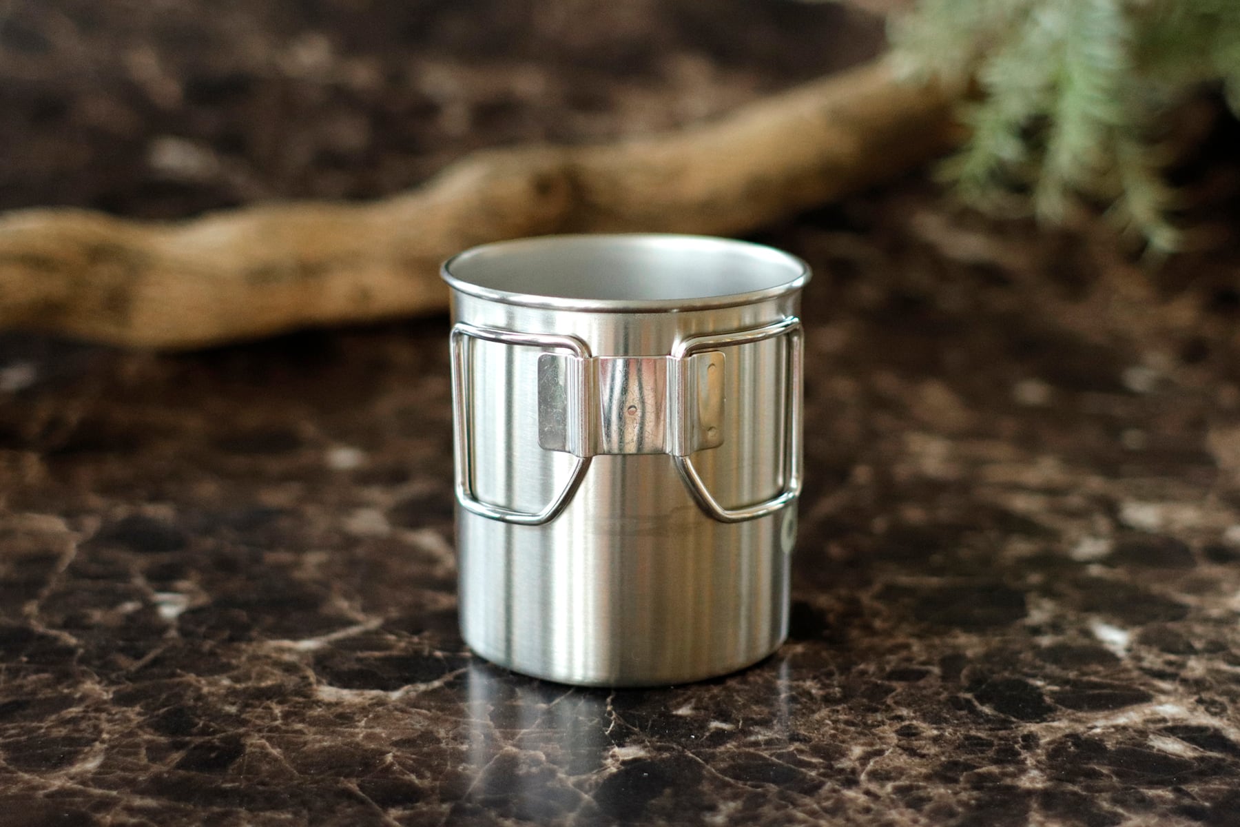 ステンレス製のマグカップは錆などの腐食に強く、軽くて持ち手の折りたたみが可能な為