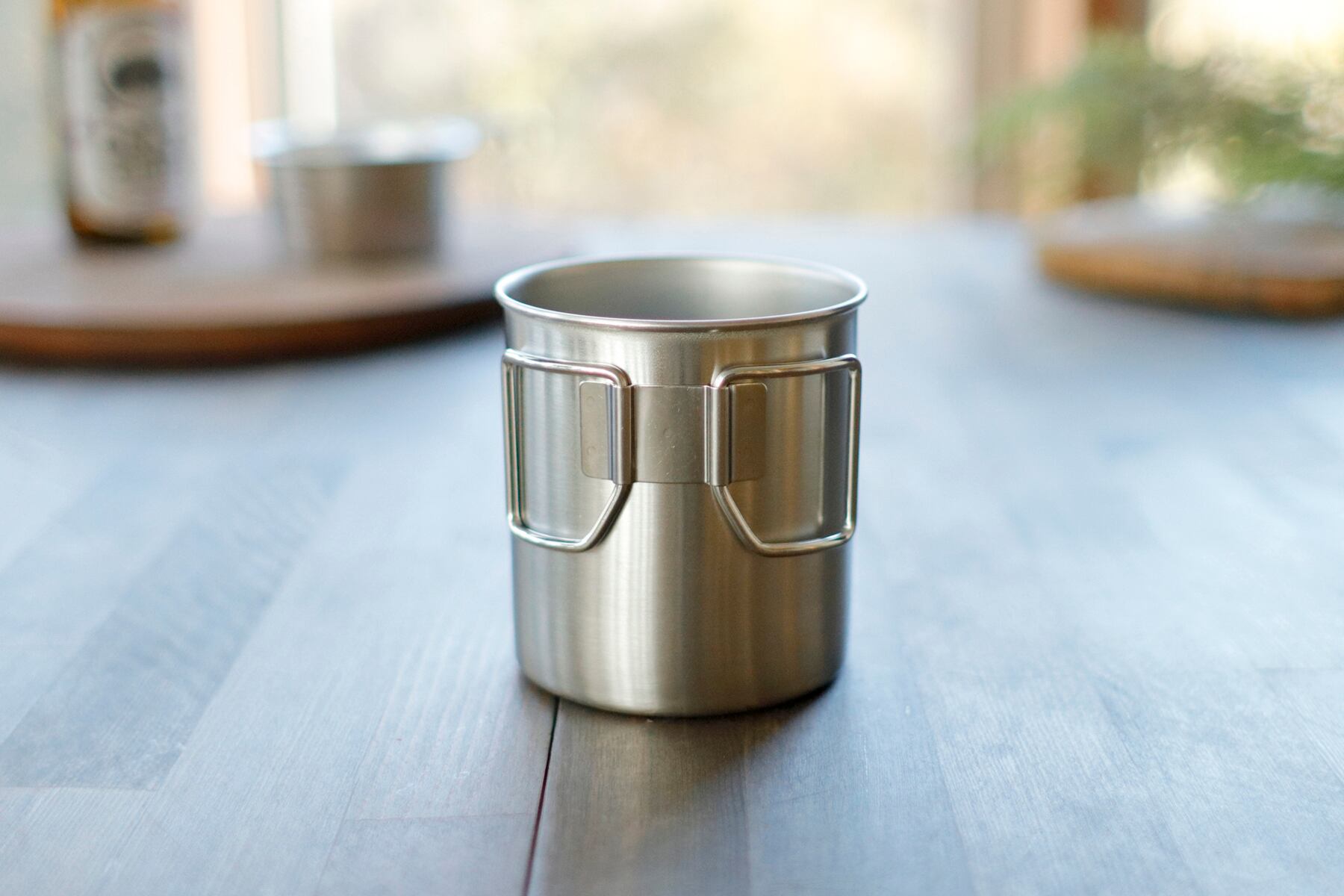 ハンドルを回して本体に収納出来るステンレス製のマグカップです。